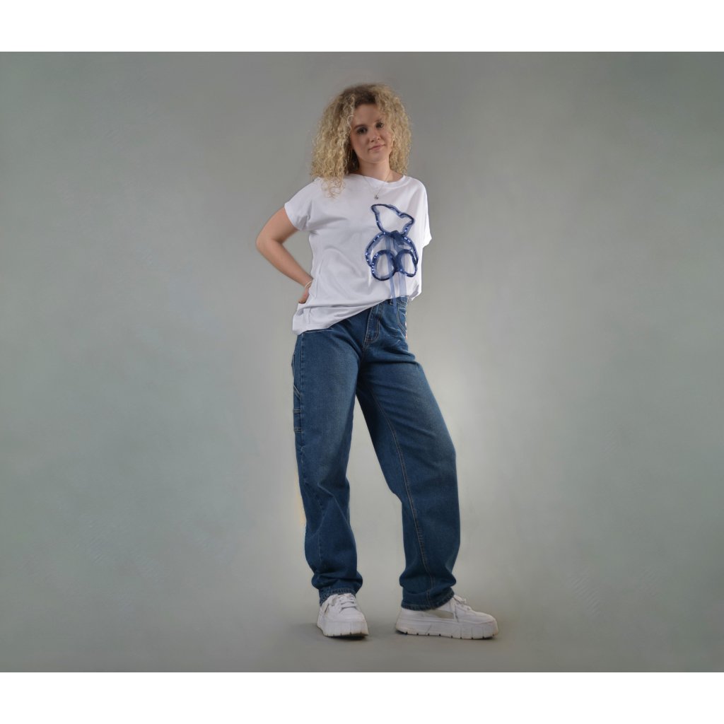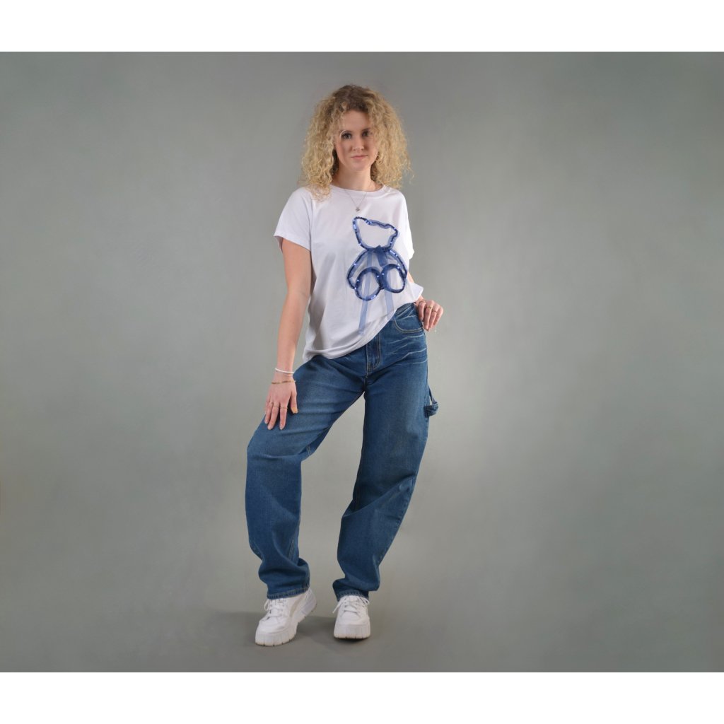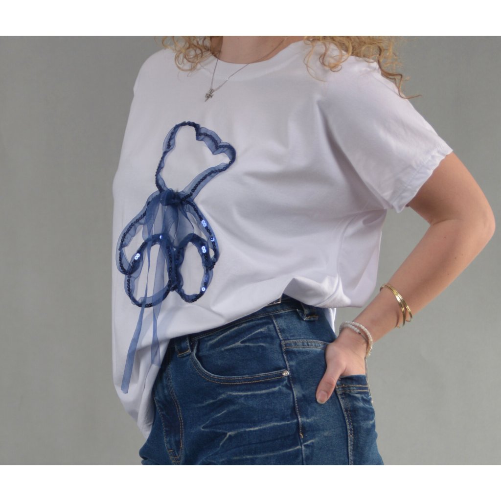 Roztomilé, hravé a zároveň stylové. Toto bílé tričko z příjemné bavlny zaujme na první pohled svým originálním aplikovaným motivem medvídka , který je vytvořený z tmavě modrých flitrů a jemnou organzovou mašli , která dodává tričku hravost a ženský šarm.