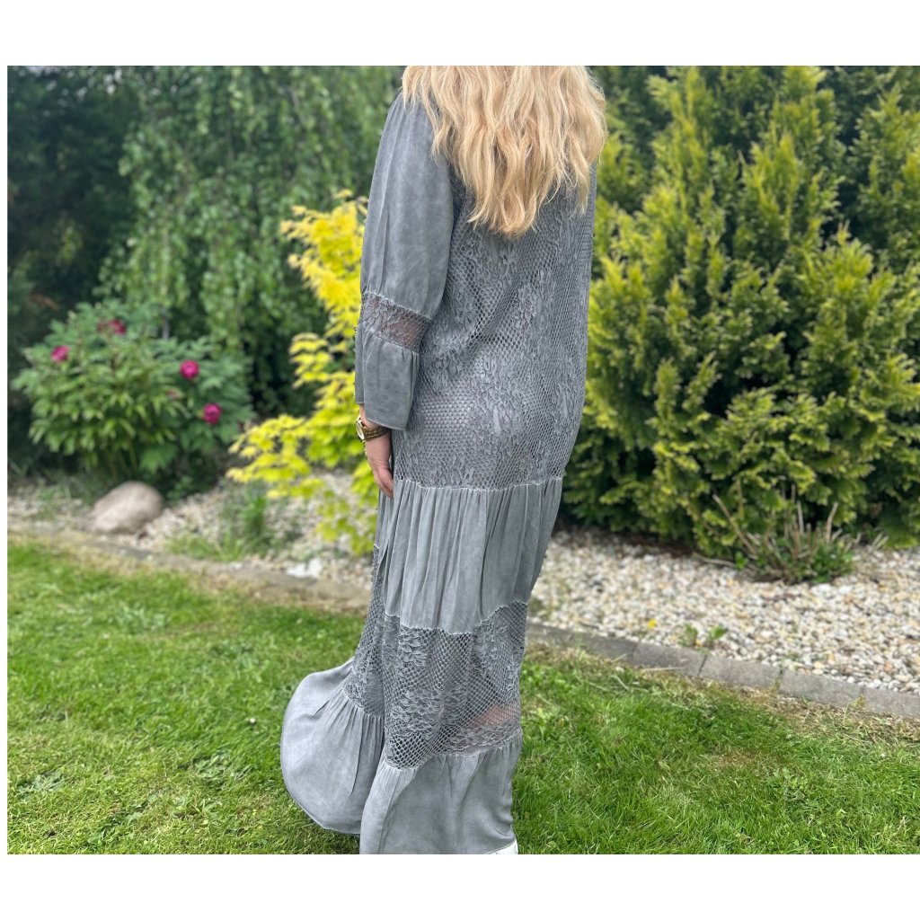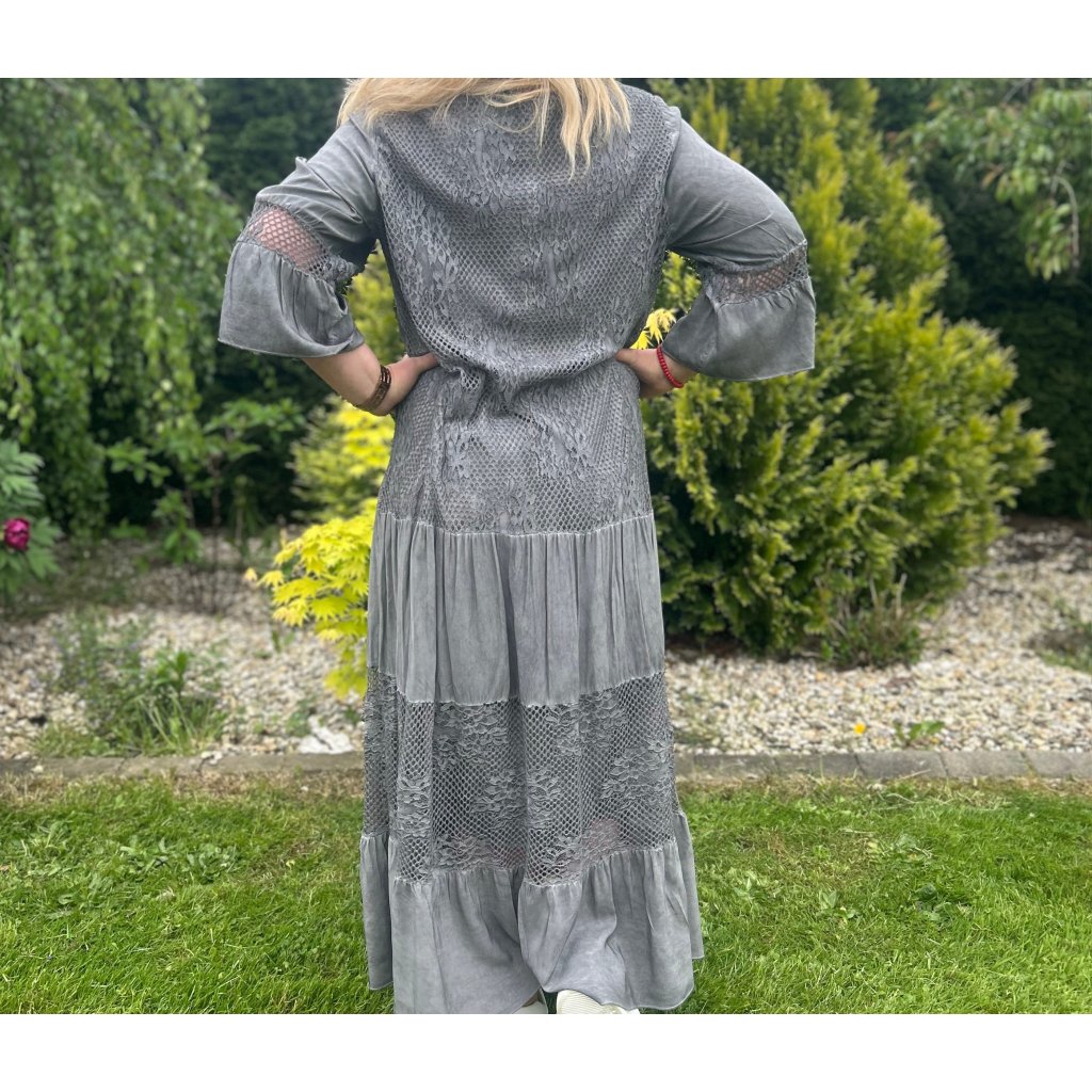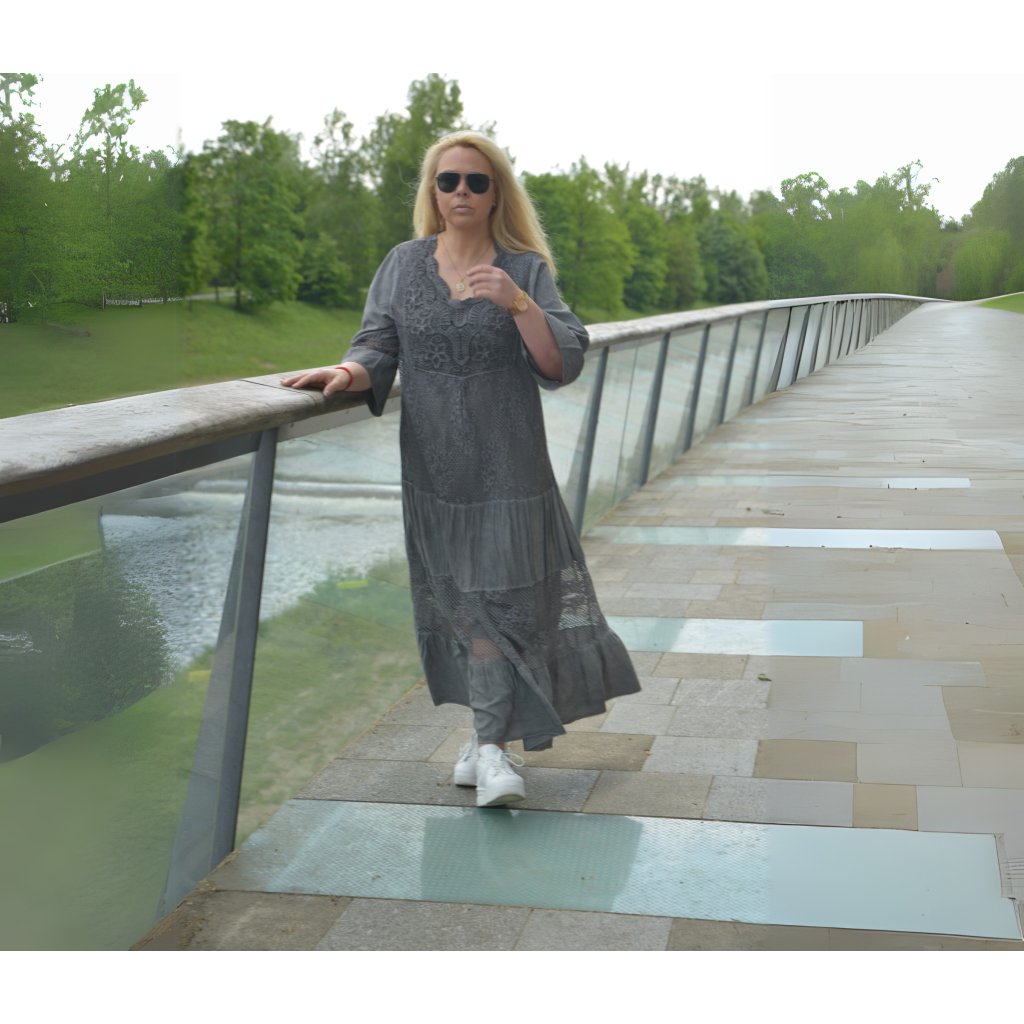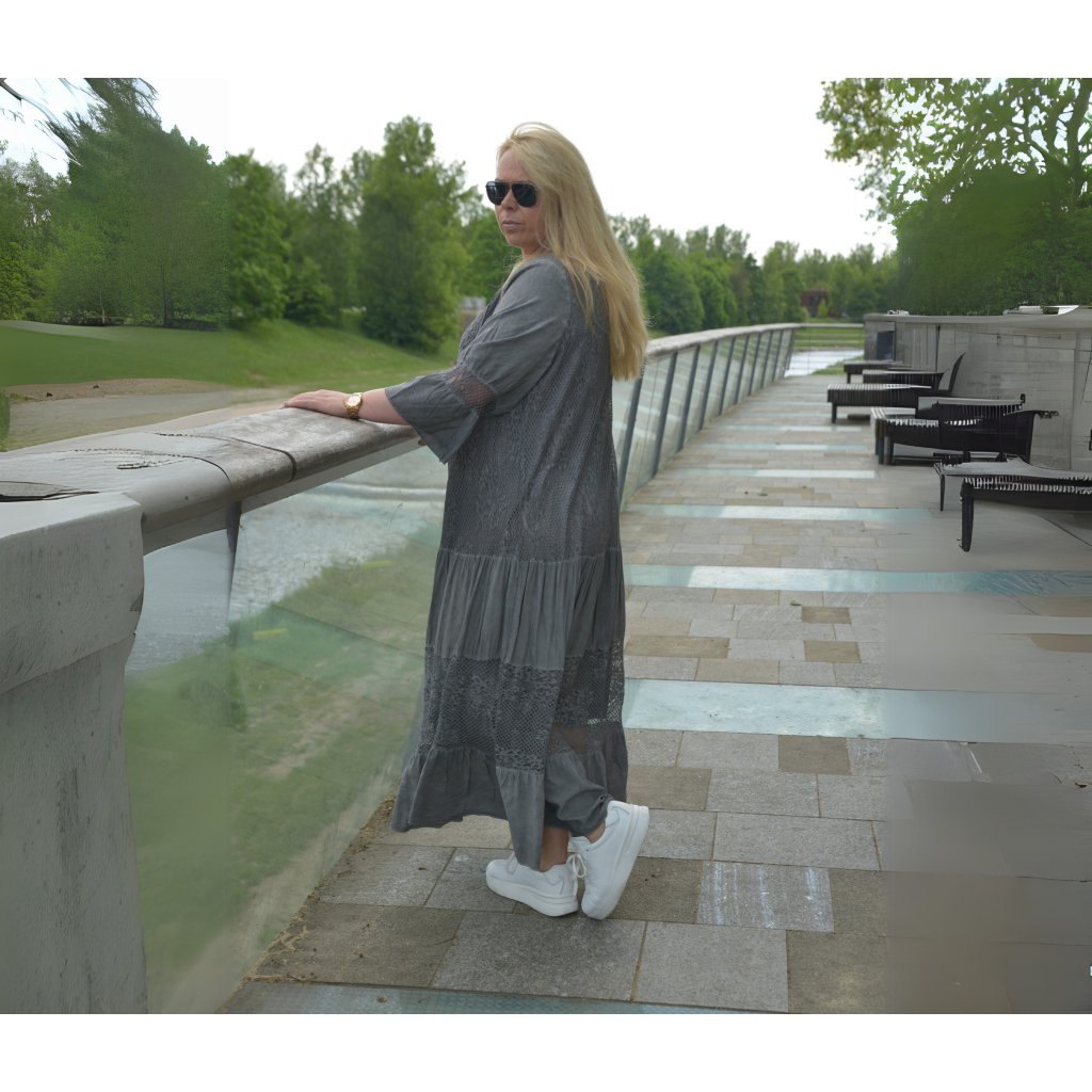 Romantika a bohémská elegance v temnějším provedení – to jsou tyto boho maxi šaty s háčkovanou krajkou v krásném odstínu antracitově šedé. Dlouhá splývavá sukně, krajkové detaily a volný střih vytvářejí ženský a pohodlný model, který oceníte během letních večerů, festivalů i běžného nošení.