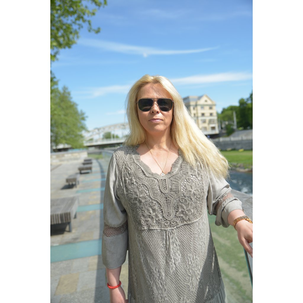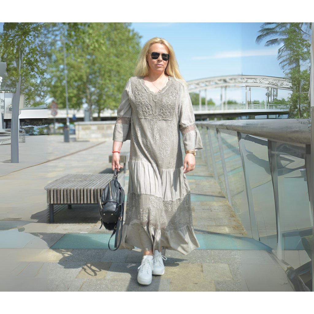 Dlouhé šaty s krajkovými vsadkami kombinují pohodlí a styl – ideální pro procházky městem, dovolenou nebo letní festival. Šaty jsou z příjemného vzdušného materiálu, mají volné tříčtvrteční rukávy a širokou spodní část pro maximální komfort.