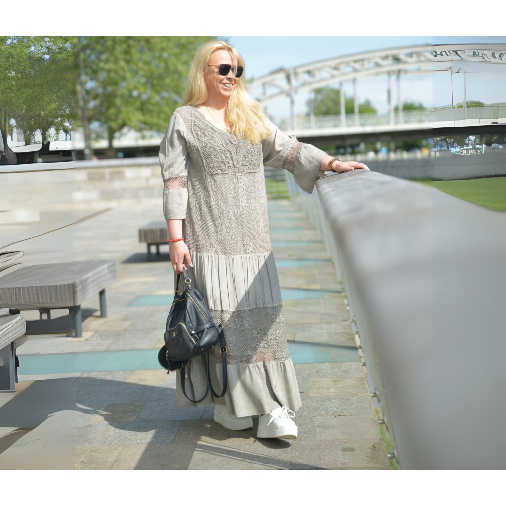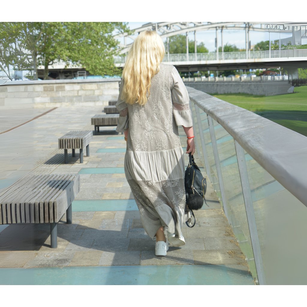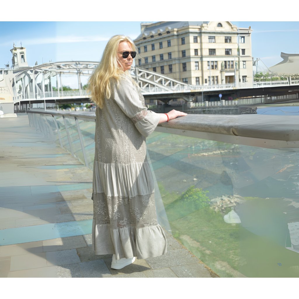 Objevte krásu bohémského stylu s těmito jedinečnými boho maxi šaty ve světlé šedé barvě, které zaujmou na první pohled. Jemně háčkovaná krajka, volnější střih a romantické detaily vytvářejí dokonale ženský outfit pro jarní i letní dny.