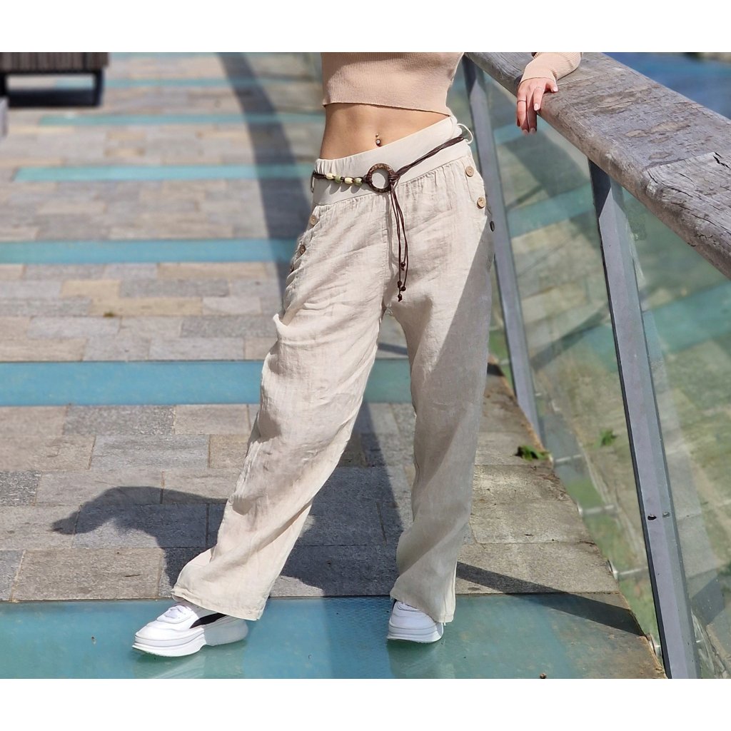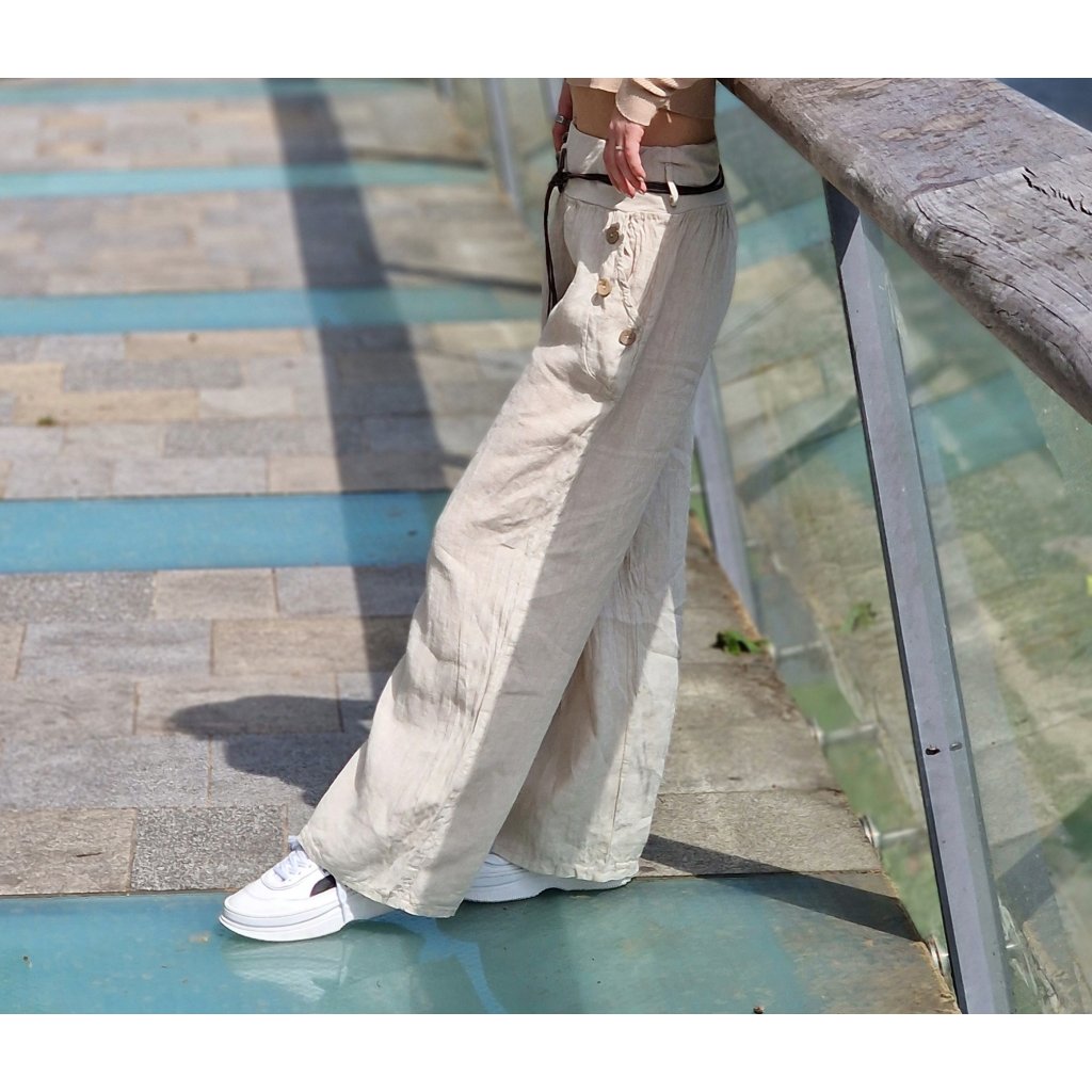 Tyto světle béžové lněné kalhoty si zamilujete pro jejich lehkost, volnost a přírodní vzhled. Jsou ideální na léto – ať už na procházku městem, na dovolenou nebo jen tak pro pohodový den. Volný střih s rovnými nohavicemi a stylovými knoflíky na boku dodává outfitu boho nádech.