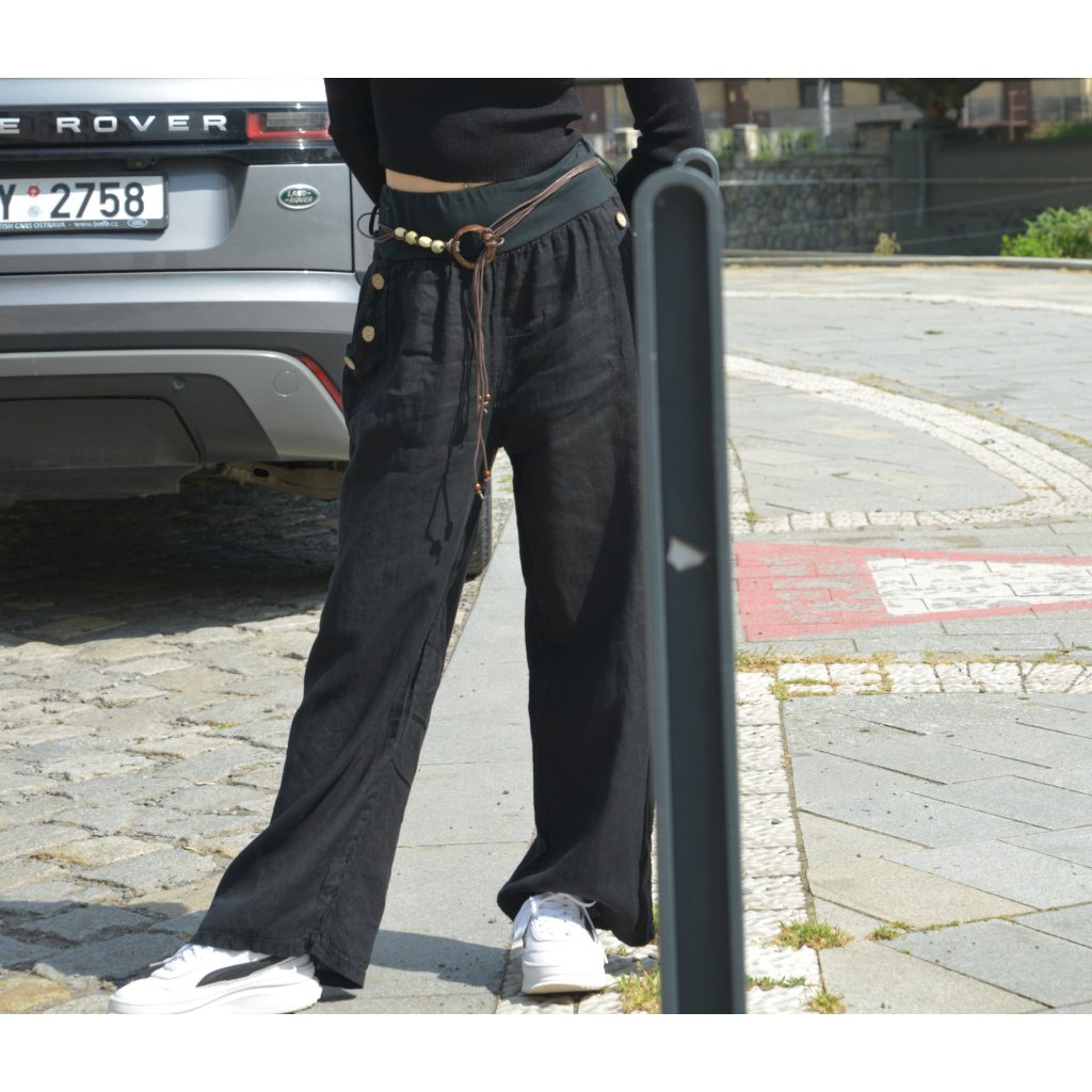 Kalhoty zdobí boční knoflíky, dvě kapsy a zavazovací pásek s dřevěnými korálky, který dotváří bohémský vzhled. Skvěle se kombinují s crop topem, volným tričkem nebo letní halenkou.
