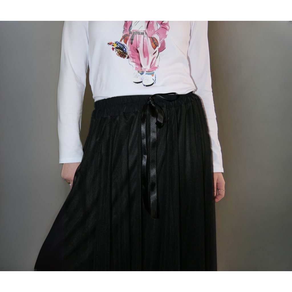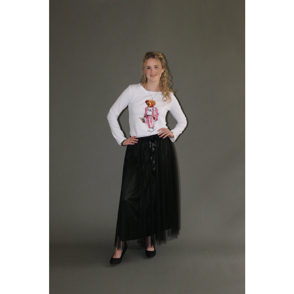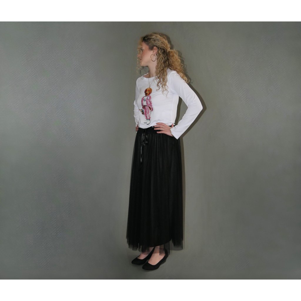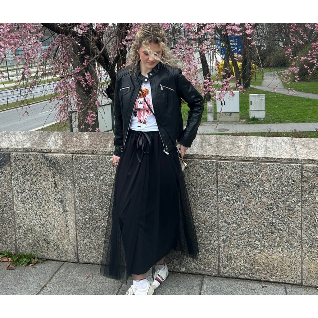 Dlouhá černá sukně z jemného tylu přináší do šatníku lehkost, romantiku i styl. Díky podšívce z neprůhledné látky působí elegantně, zatímco průsvitný tyl dodává celému outfitu lehce éterický vzhled.