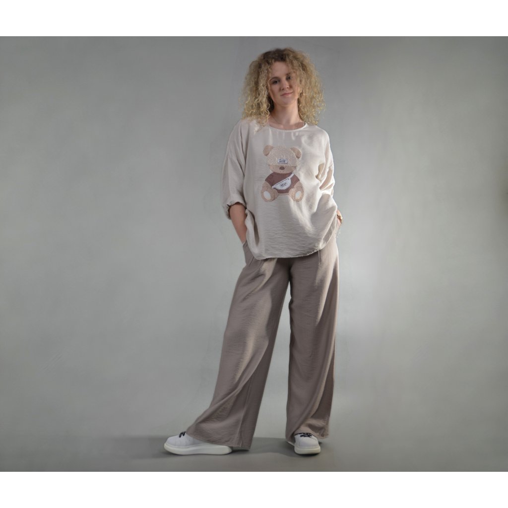 Lehký a prodyšný materiál ideální na jaro a léto Široký střih, který neomezuje v pohybu Stylový a univerzální taupe odstín Italský ležérní styl, který zvládne jak volný den, tak elegantní outfit