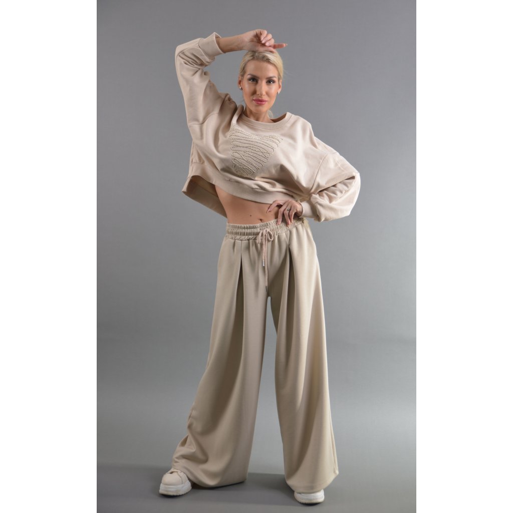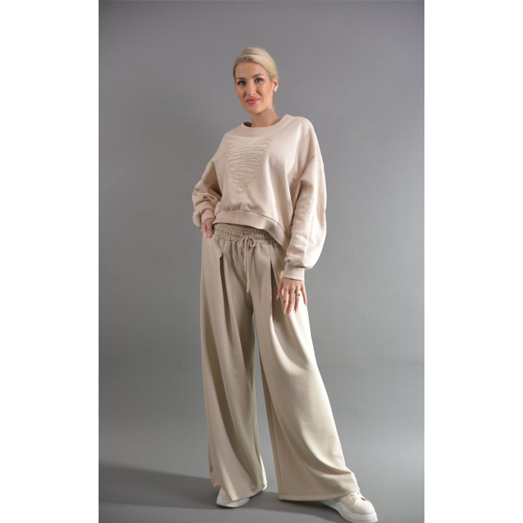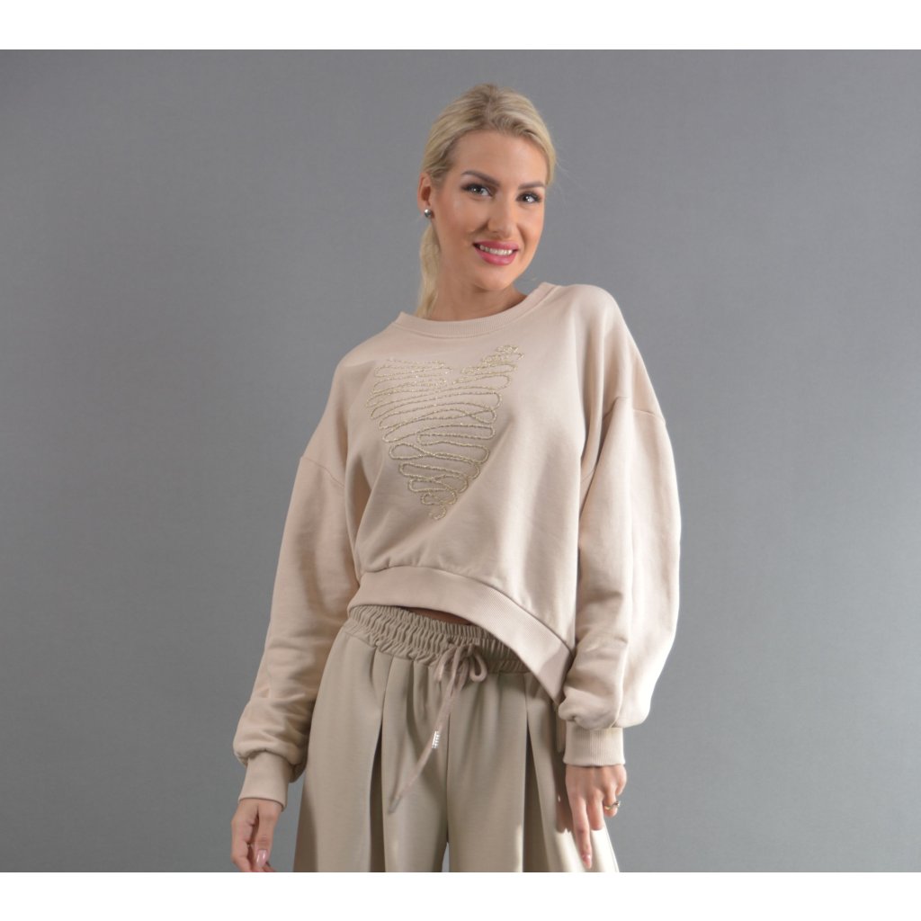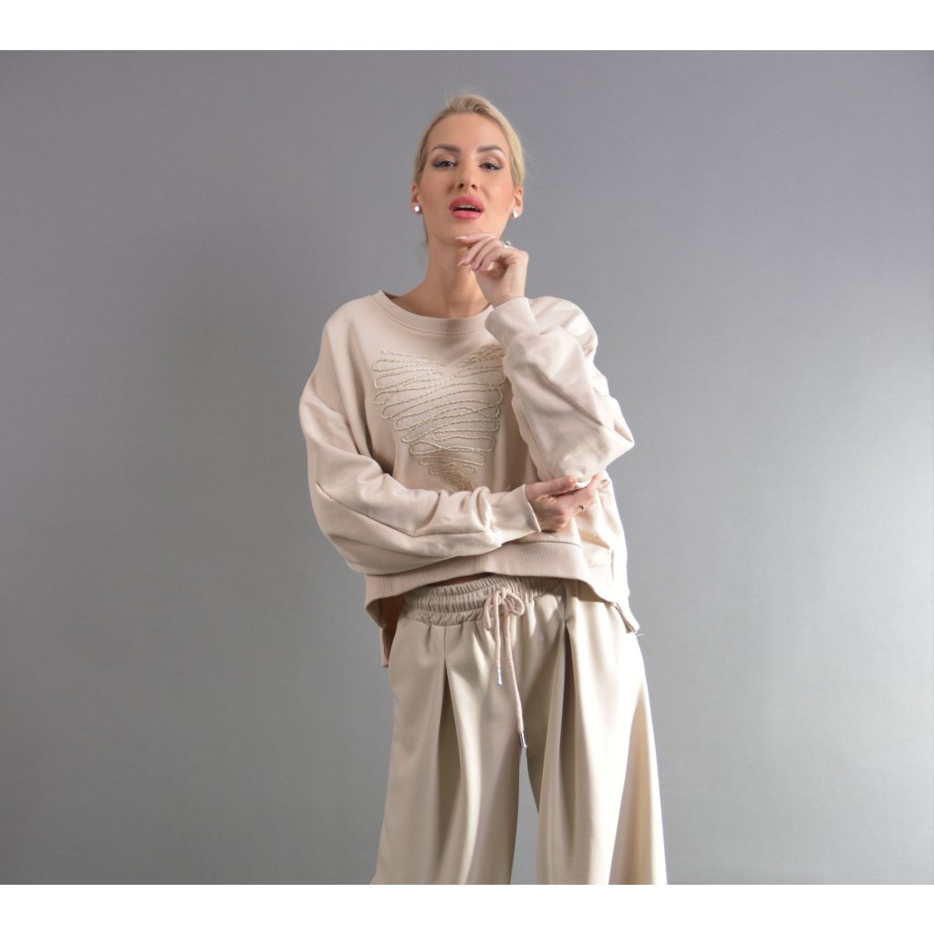 Když se spojí komfort s elegancí, vznikne dokonalý kousek. Tato exkluzivní mikina v jemném béžovém odstínu je mistrovským dílem, které přináší nejen pohodlí, ale i luxusní vzhled. Dominantní aplikace ve tvaru srdce s precizním zdobením dodává modelu sofistikovanost a nádech exkluzivity. Oversized střih a měkký materiál zajišťují maximální komfort, takže si tento kousek zamilujete jak na běžné nošení, tak i do elegantních casual outfitů.