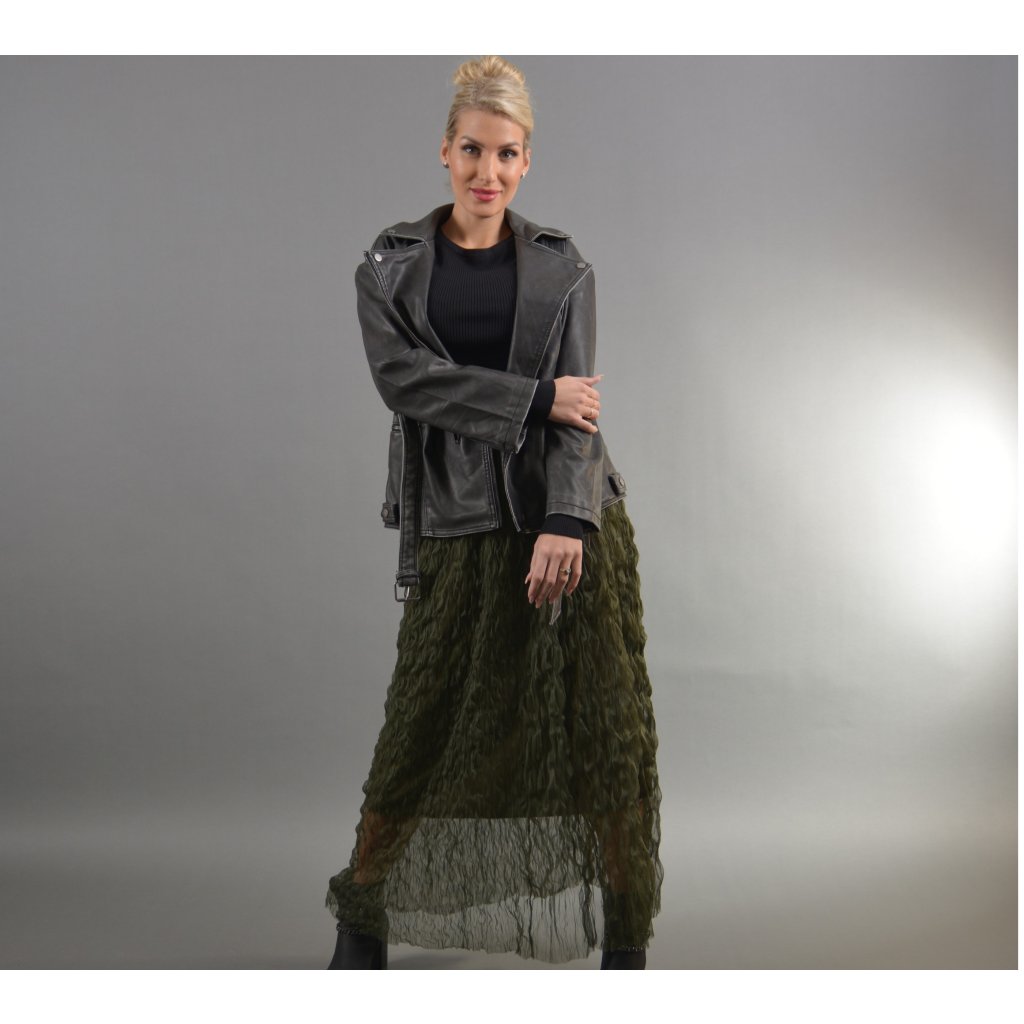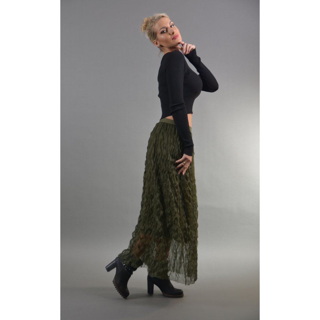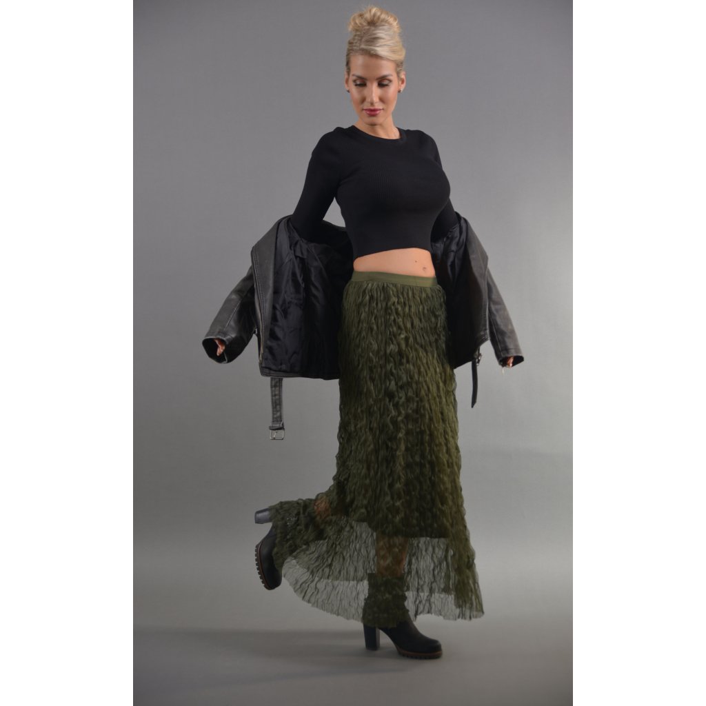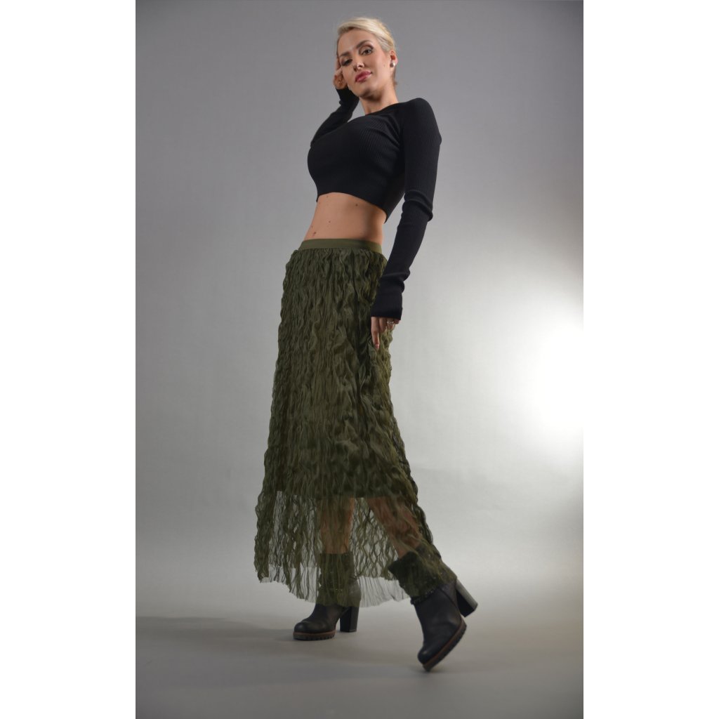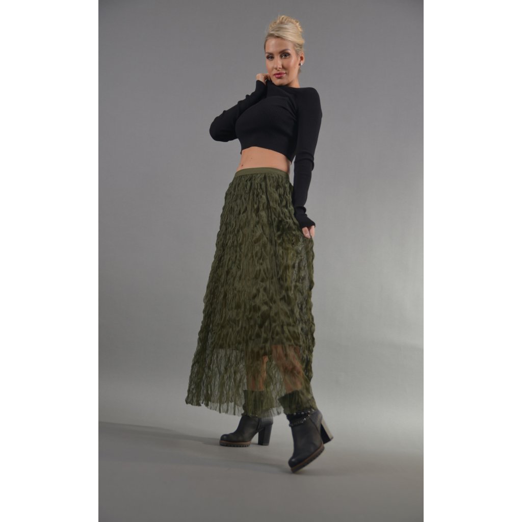 Nadčasová elegance spojená s moderním designem! Tato maxi sukně z jemného tylu v khaki odstínu je dokonalým kouskem pro ženy, které milují sofistikovaný styl s lehkým nádechem extravagance. Strukturovaný efekt dodává sukni jedinečný vzhled, zatímco průhledný spodek působí vzdušně a stylově.