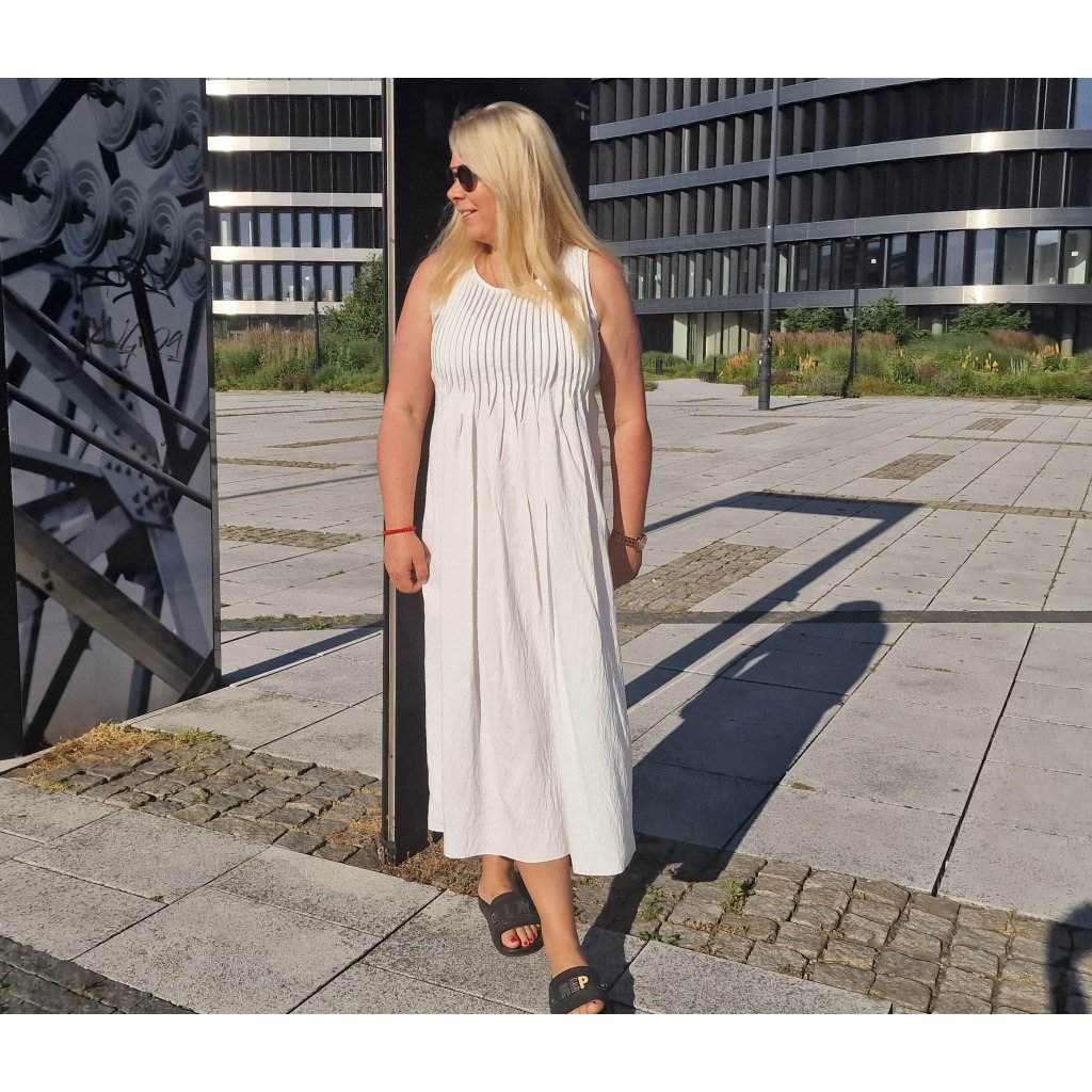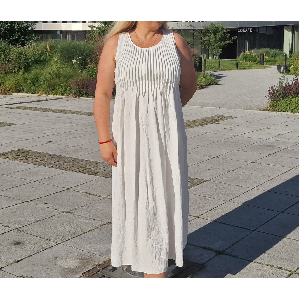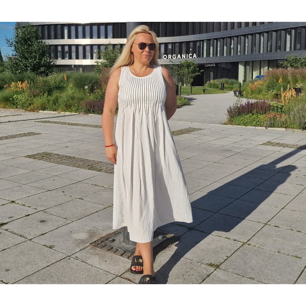 Nadčasová elegance v jednoduchém provedení – tyto bílé šaty bez rukávů jsou ideální volbou na letní dny, kdy chcete vypadat upraveně a cítit se pohodlně. Horní část je ozdobena jemným svislým řasením, které opticky prodlužuje postavu a dodává šatům jemnost.
