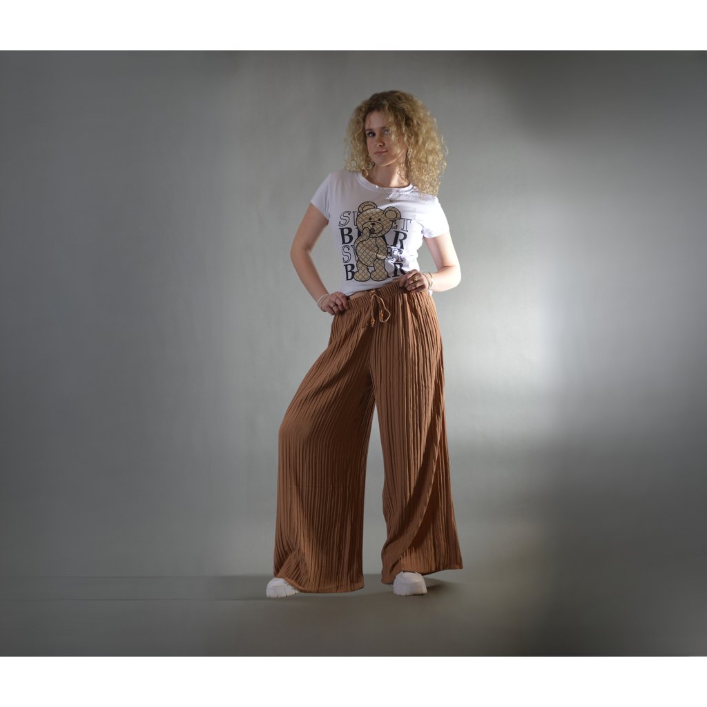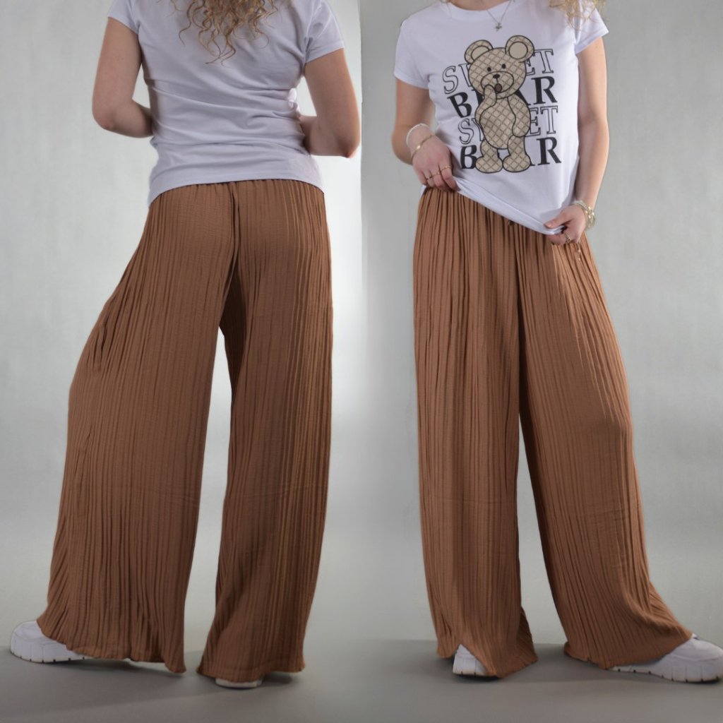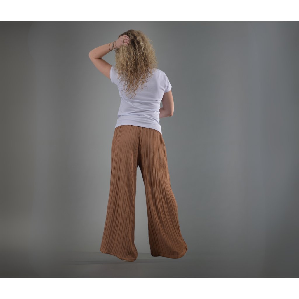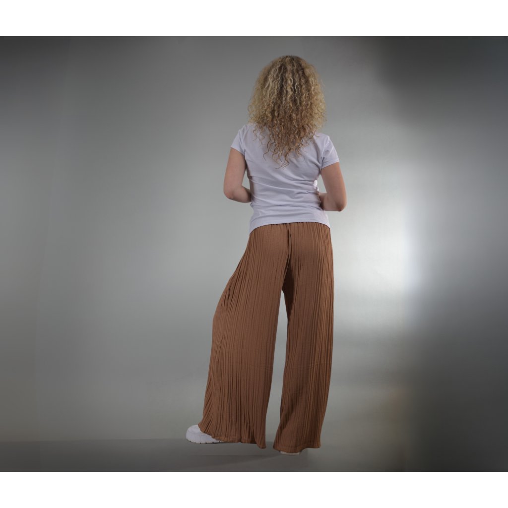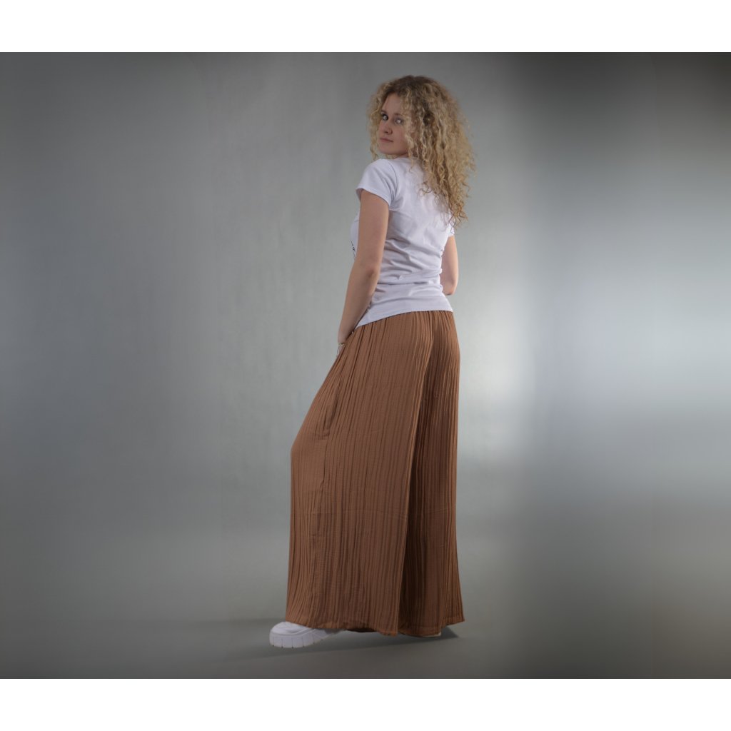 Tyto vzdušné kalhoty v teplém hnědém odstínu spojují komfort, eleganci a nenucený italský styl. Plisovaný efekt po celé délce dodává kalhotám exstravagantní šmrnc, zatímco volný střih s širokými nohavicemi zajišťuje naprostou volnost pohybu a pohodlí po celý den.