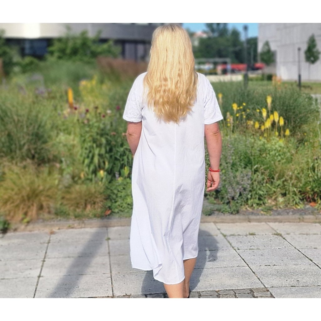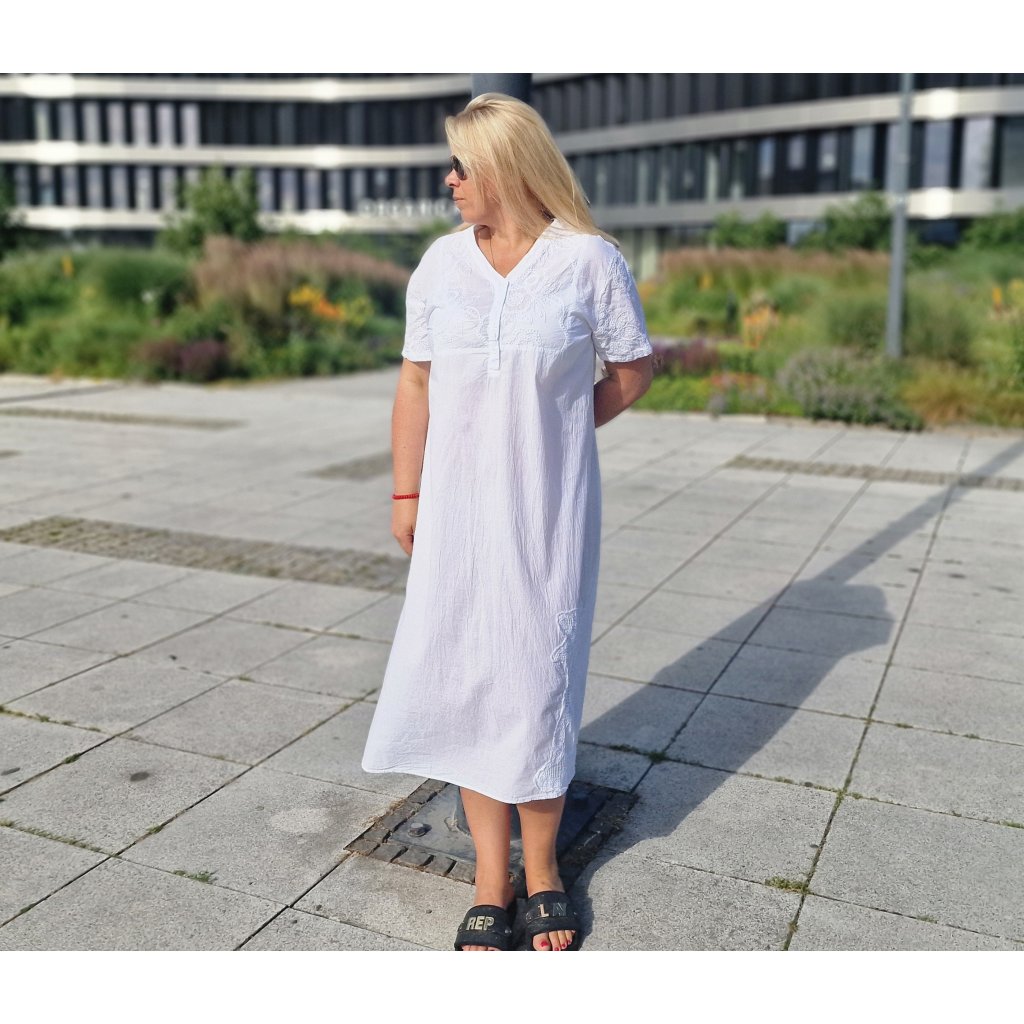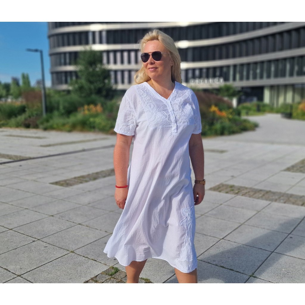 Jednoduchost, lehkost a čistota stylu – to přesně vystihuje tyto bílé letní šaty s výšivkou. Jsou ideální volbou pro horké dny, kdy chcete vypadat upraveně, ale cítit se maximálně pohodlně. Volný střih jemně splývá kolem postavy, výstřih do V a krátké rukávy s výšivkou působí romanticky a přirozeně.
