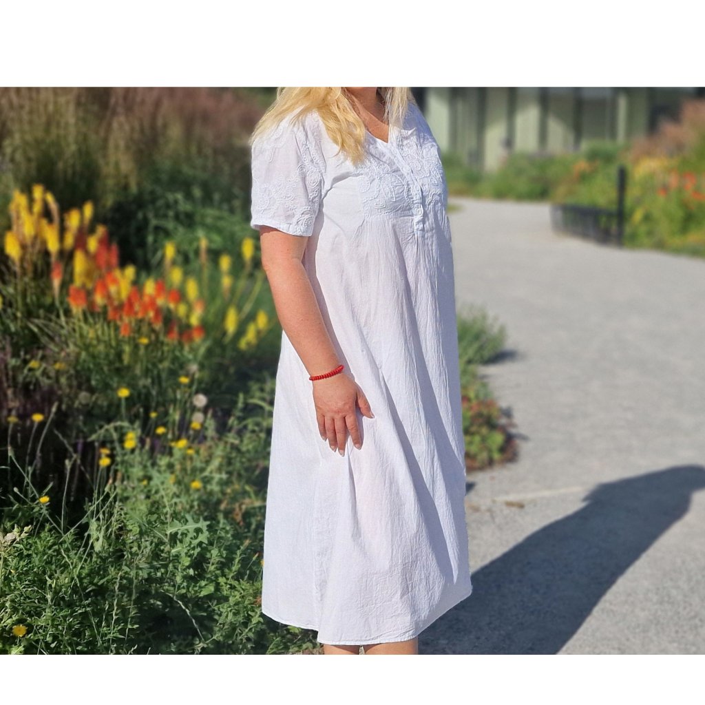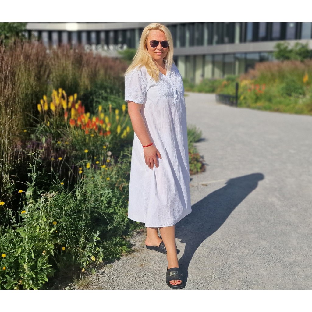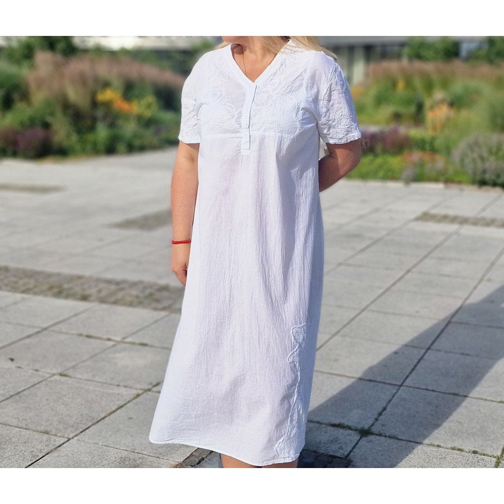 Jednoduchost, lehkost a čistota stylu – to přesně vystihuje tyto bílé letní šaty s výšivkou. Jsou ideální volbou pro horké dny, kdy chcete vypadat upraveně, ale cítit se maximálně pohodlně. Volný střih jemně splývá kolem postavy, výstřih do V a krátké rukávy s výšivkou působí romanticky a přirozeně.