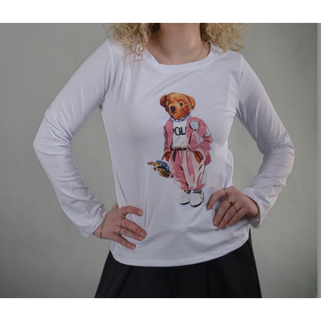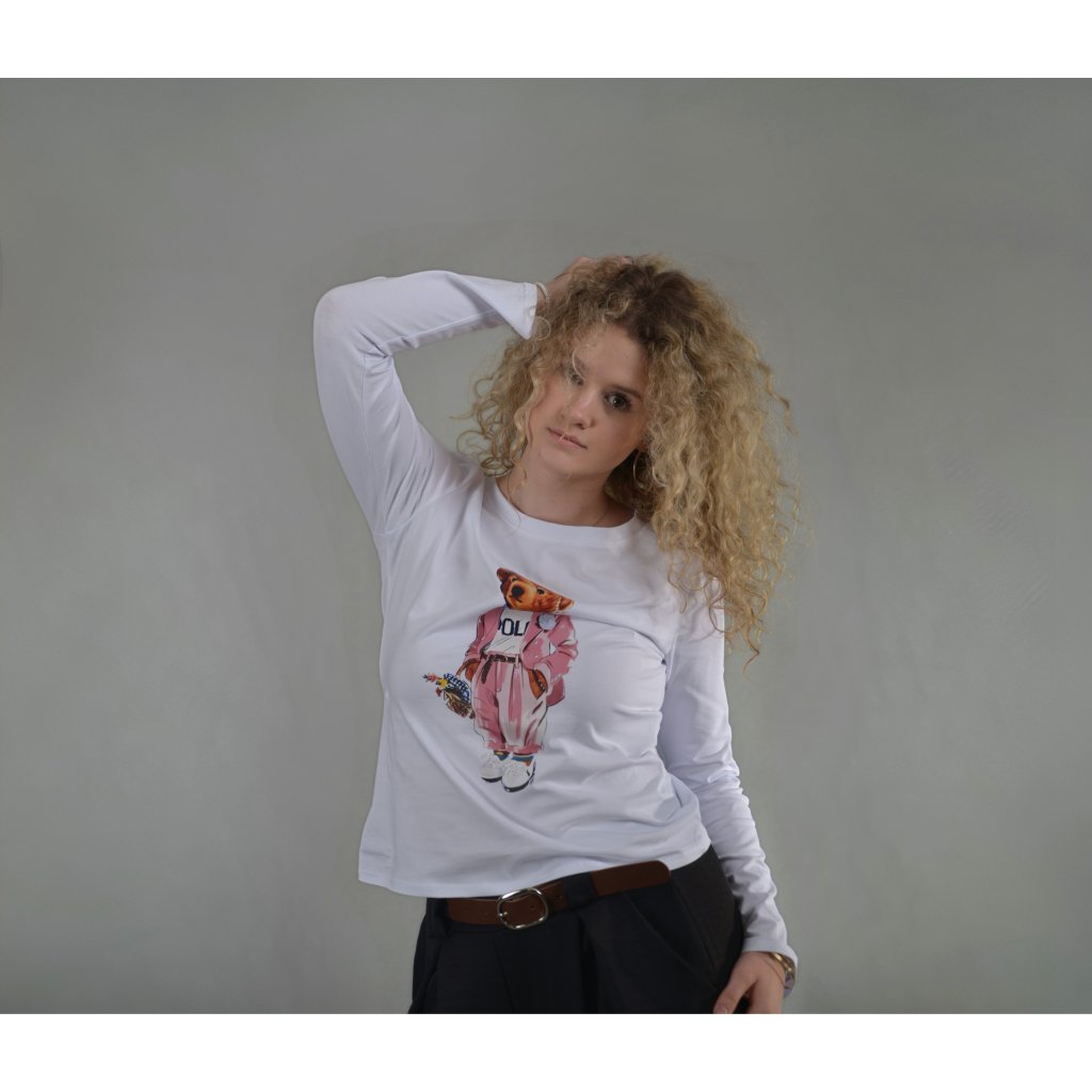 Toto stylové bílé tričko s dlouhým rukávem přináší do vašeho outfitu hravost, originalitu a špetku italského humoru. Dominantním prvkem je barevný potisk medvídka v růžovém oversize outfitu , který působí, jako by právě vystoupil z módní přehlídky streetwearu. Jedinečný motiv dodává tričku výrazný charakter.