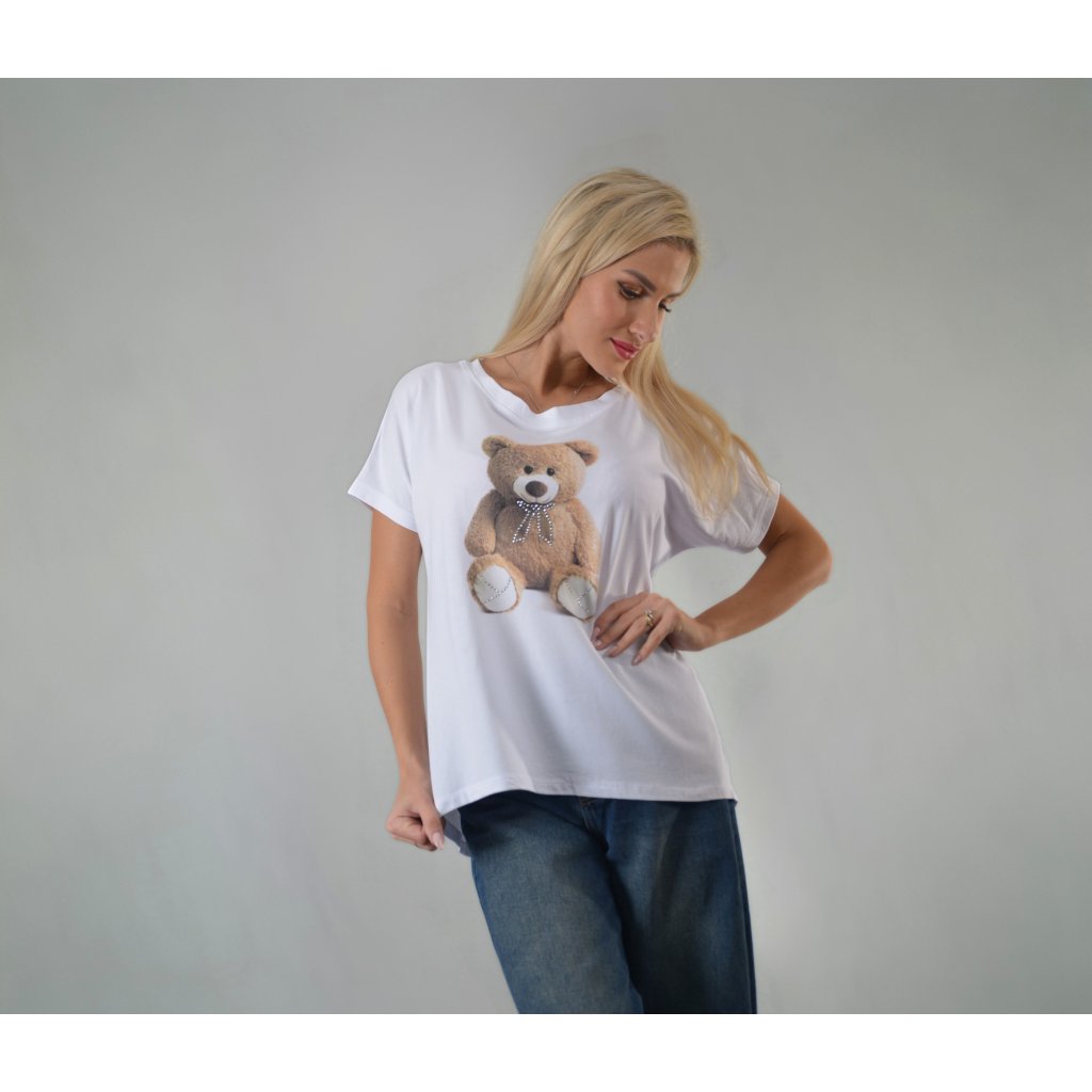 Roztomilé bílé tričko s 3D motivem medvídka je ideální volbou pro ženy, které chtějí dodat svému outfitu hravý a originální prvek. Pohodlný volnější střih a příjemný materiál zaručují komfort po celý den. Medvídek s aplikací a ozdobnými detaily dodává tričku jedinečný vzhled, který zaujme na první pohled. Skvěle se hodí k džínům, šortkám i sukním – perfektní kousek pro uvolněný, ale stylový look!