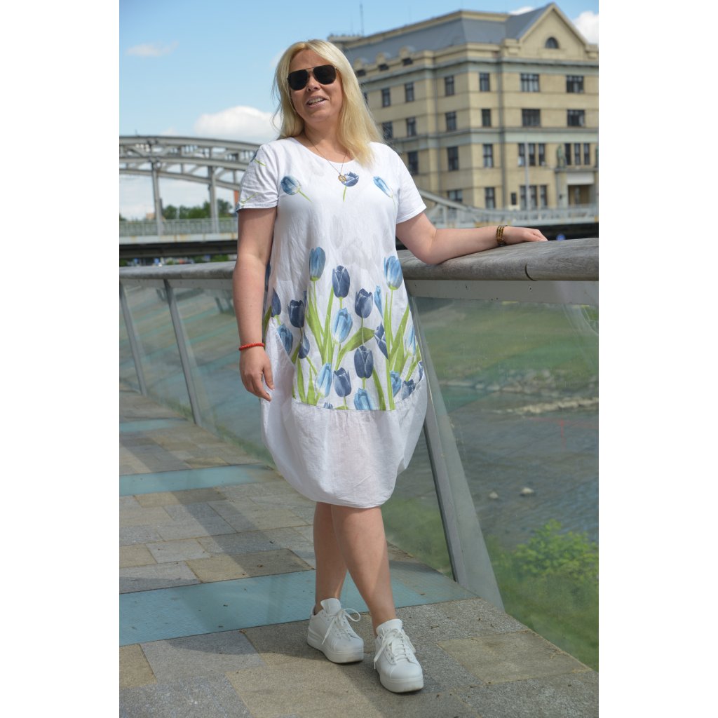 Rozkveťte v pohodlí a stylu! Tyto bílé letní šaty s potiskem modrých tulipánů vám vykouzlí úsměv na tváři i během obyčejného dne. Díky balonovému střihu jsou pohodlné, vzdušné a originální. Výrazný květinový motiv v oblasti sukně dodává šatům veselý a ženský nádech.
