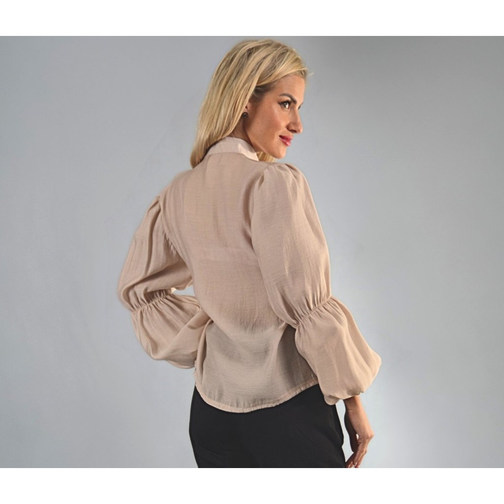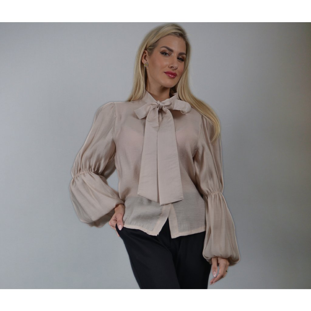 Romantická a sofistikovaná – tato béžová halenka s elegantní mašlí u krku a nadýchanými rukávy přináší noblesní styl s nádechem vintage elegance. Lehký materiál krásně splývá na postavě, zatímco rafinované detaily jako nabírané rukávy a jemné zapínání podtrhují její jedinečnost. Perfektní volba pro ženy, které chtějí působit elegantně a vkusně, ať už v práci, na společenské události nebo při zvláštních příležitostech. Snadno ji zkombinujete s kalhotami nebo sukní pro dokonalý šik vzhled.