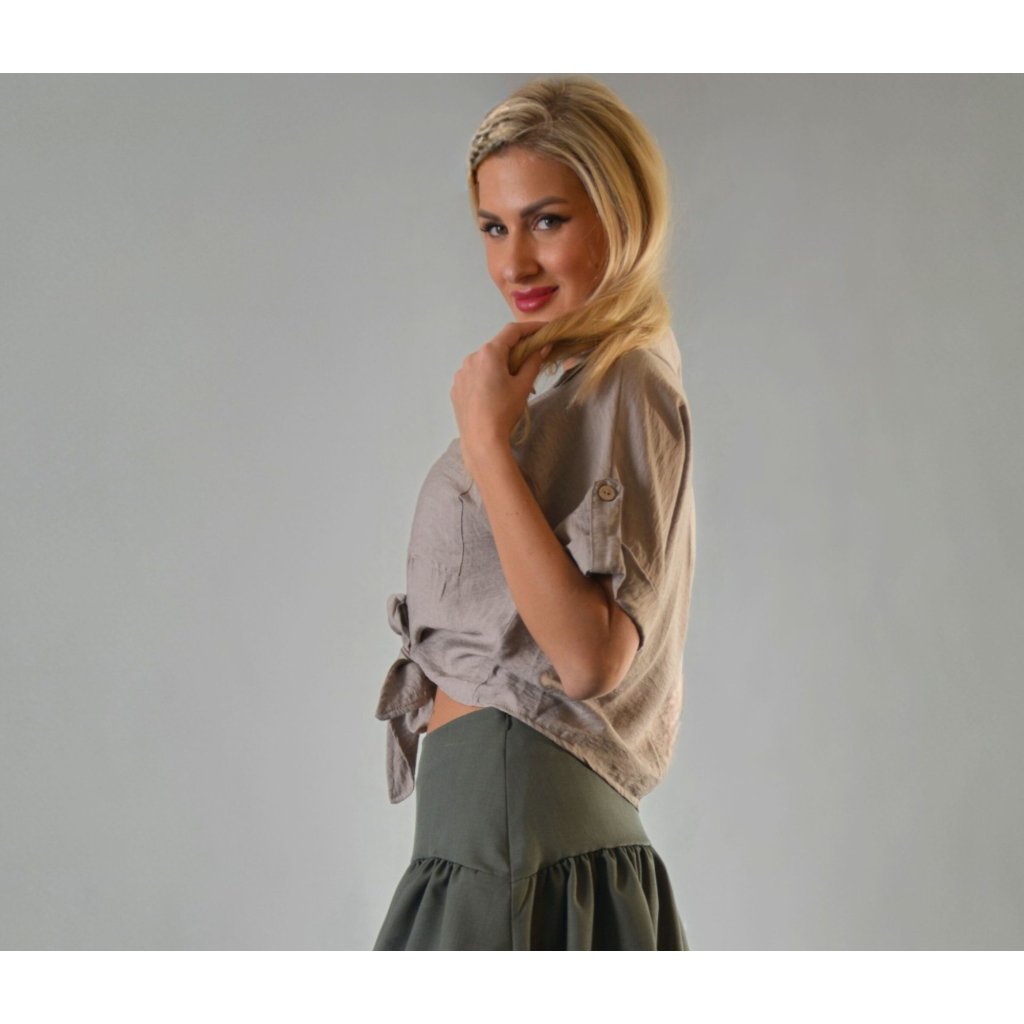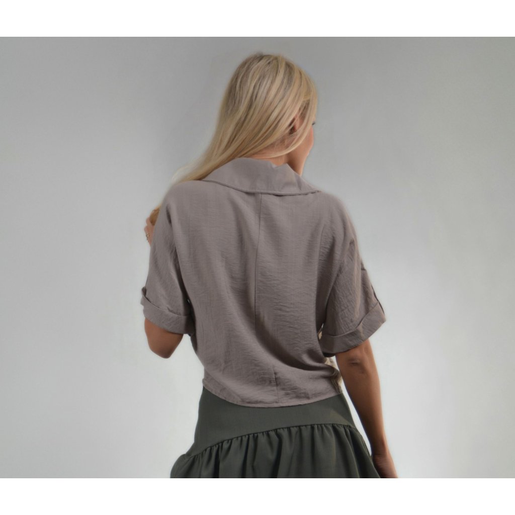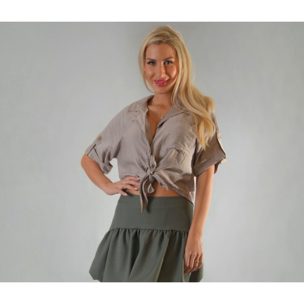 Lehká béžová košile s krátkým rukávem a zavazováním v pase je ideální volbou pro ženy, které milují stylovou ležérnost. Díky vzdušnému materiálu se skvěle nosí po celý den, zatímco volnější střih a jemná struktura látky dodávají outfitu moderní vzhled. Krátké rukávy s ohrnutím a zapínání na knoflíčky podtrhují její casual eleganci. Perfektně se hodí ke kalhotám, džínům i sukním – pro uvolněný i sofistikovaný look. Nadčasový kousek, který nesmí chybět ve vašem šatníku!